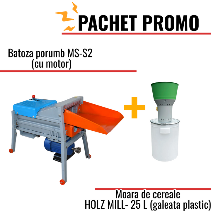 Batoza de porumb MS-S2 are o putere de lucru de 2500 kg/h. Este un utilaj necesar pentru gospodarii, dar mai ales pentru crescatorii de animale, intrucat le usureaza foarte mult munca. Motorul sau este de 2.2 kW / 3000 RPM si tensiune de 220 V.