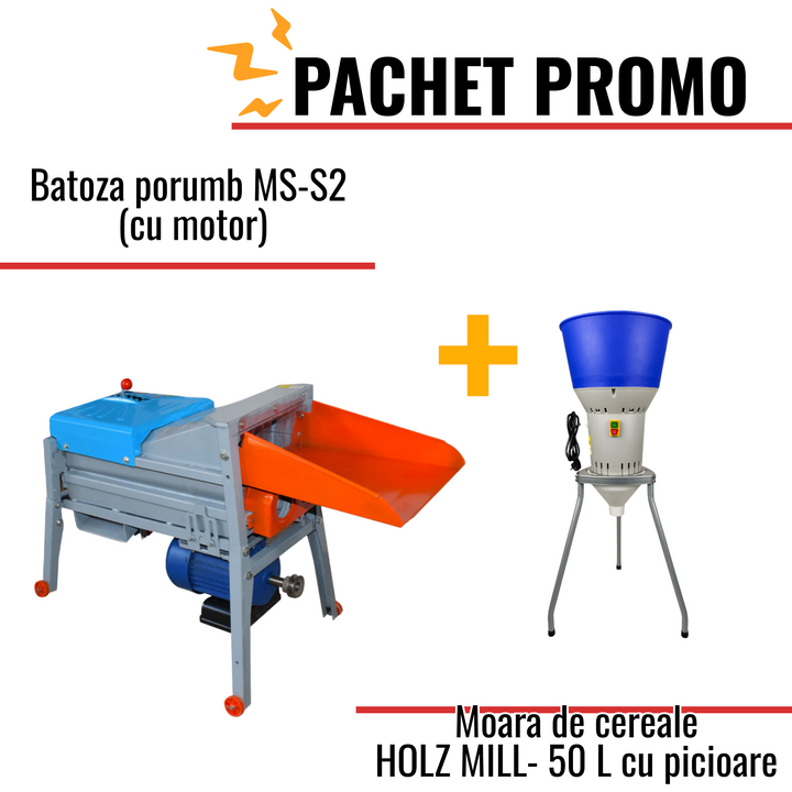 Batoza de porumb MS-S2 are o putere de lucru de 2500 kg/h. Este un utilaj necesar pentru gospodarii, dar mai ales pentru crescatorii de animale, intrucat le usureaza foarte mult munca. Motorul sau este de 2.2 kW / 3000 RPM si tensiune de 220 V.
