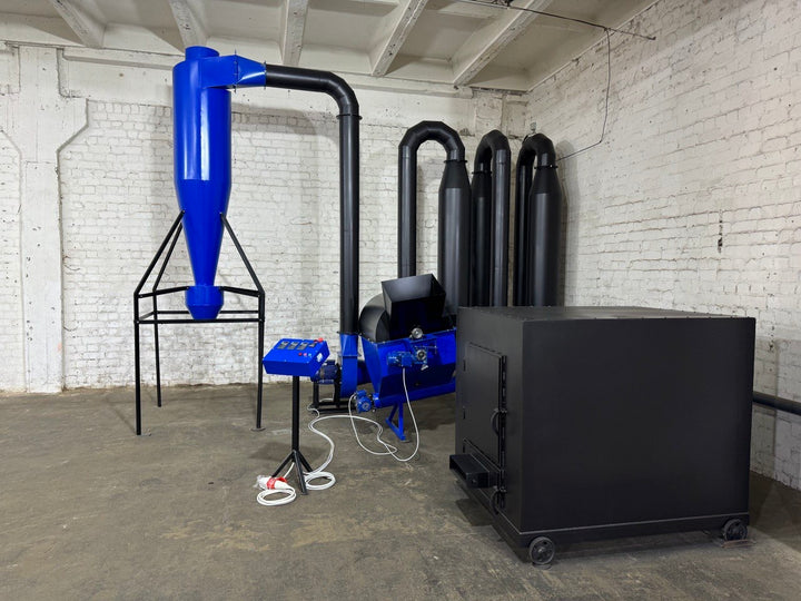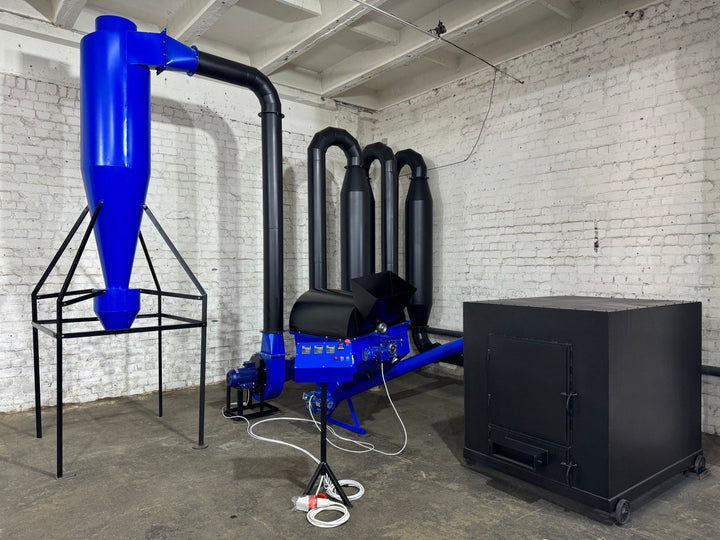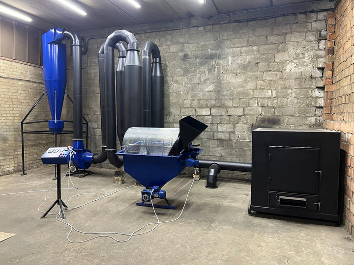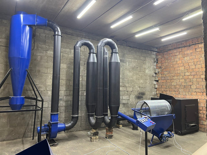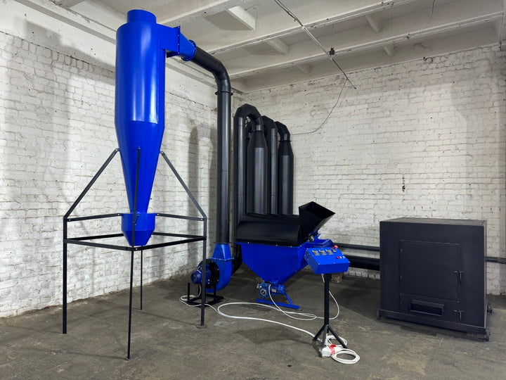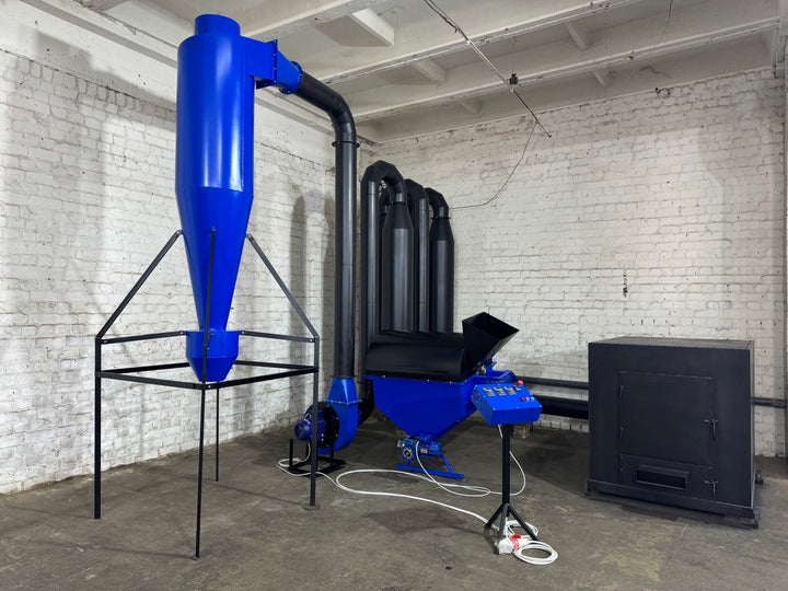 Uscator aerodinamic SK 300, cu o capacitate maxima de pana la 300 kg/ora, este conceput pentru uscarea preliminara a rumegusului pentru granulare si brichetare ulterioara. Kitul include un cuptor fara caramizi refractare, o sita cu alimentare uniforma, un panou de control si complexul de uscare in sine.