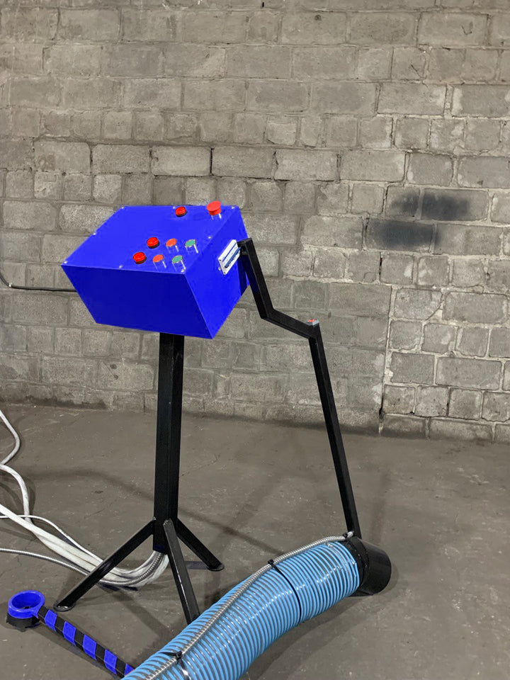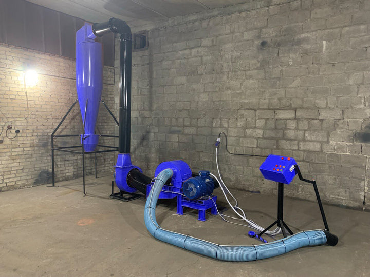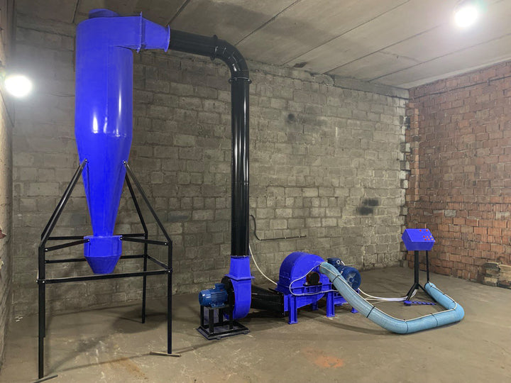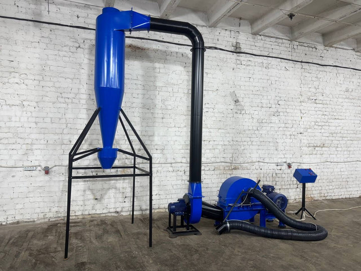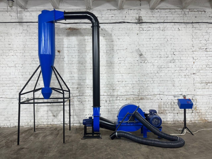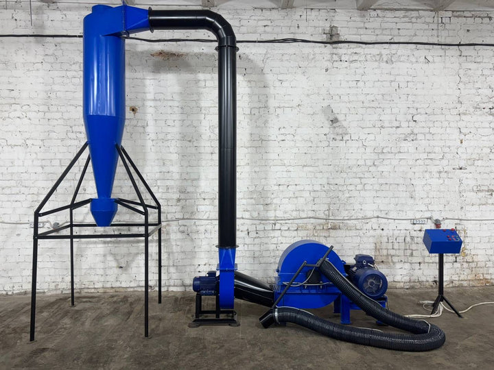 Setul include un tocator, un ventilator cu ciclon, un panou de control si un furtun pentru aspirarea materiilor prime.
