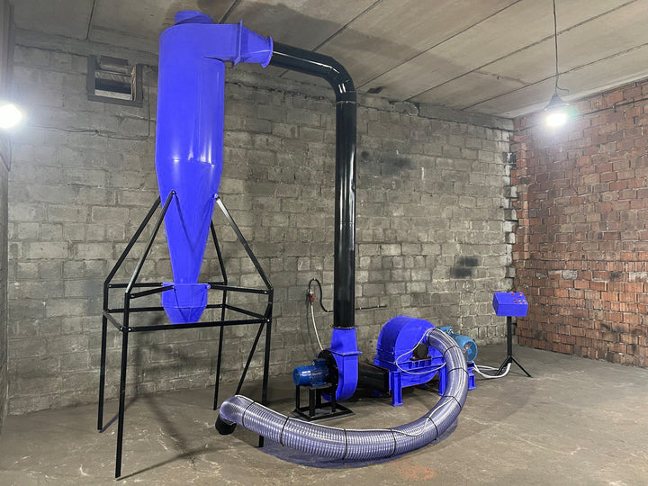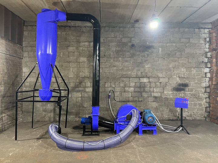 Kitul include un tocator, un ventilator cu ciclon, un panou de control, un furtun ondulat pentru aspirarea materiilor prime.