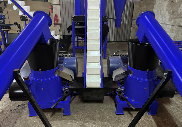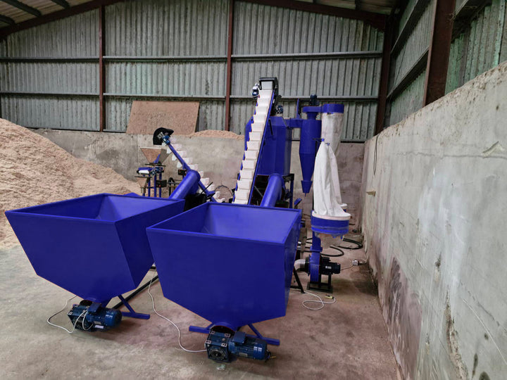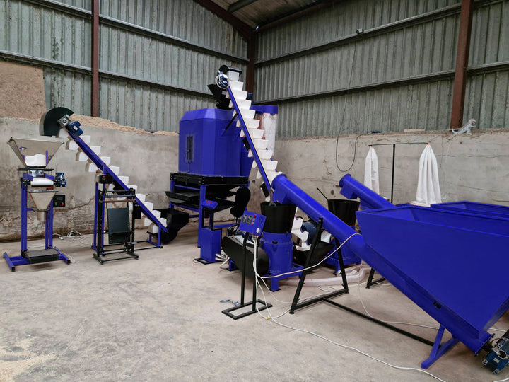 Linie de peletare LG 1000 cu sistem de ambalare cu o capacitate maxima de pana la 1000 kg/ora. Setul include: Snec de alimentare - 2 buc., Presa peleti cu o capacitate de pana la 500 kg/ora - 2 buc., diametru matrice 400 mm, motor de 45 kW, banda racire granule (acumulativ), cantar, aparat de lipit saci. Complex de la alimentarea cu materii prime pana la ambalarea in saci de 5, 10 si 15 kg a produselor finite.