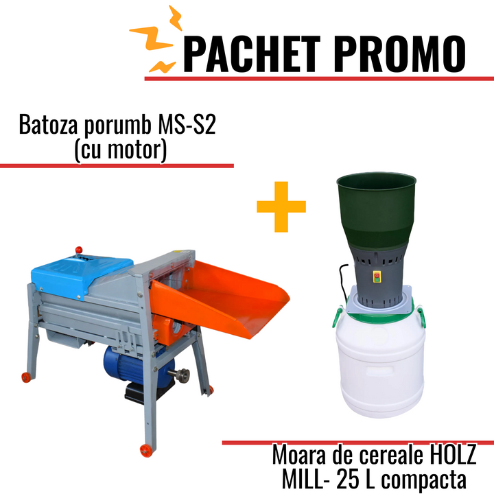 Pachet Promo: Batoza porumb MS-S2 (cu motor) + Moara de cereale HOLZ MILL- 25 L compacta cu galeata