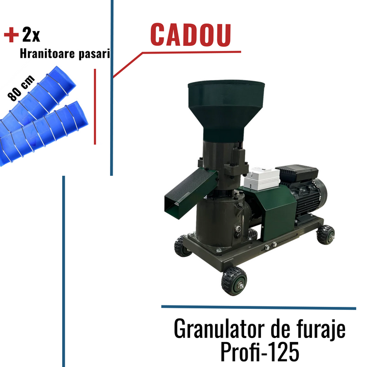 Pachet Promo:Granulator de furaje Profi-125 cu 3 matrite +CADOU:2x Hranitoare pasari 80cm