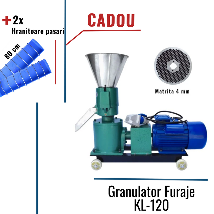 Granulatorul de furaje KL-120 are o putere de lucru de 80 kg/h. Este un utilaj necesar pentru gospodarii, dar mai ales pentru crescatorii de animale, intrucat le usureaza foarte mult munca. Acest utilaj dispune de un motor de 3 kW / 1500 RPM si cu o tensiune de 230 V, iar transmisia puterii se face prin intermediul reductorului.
