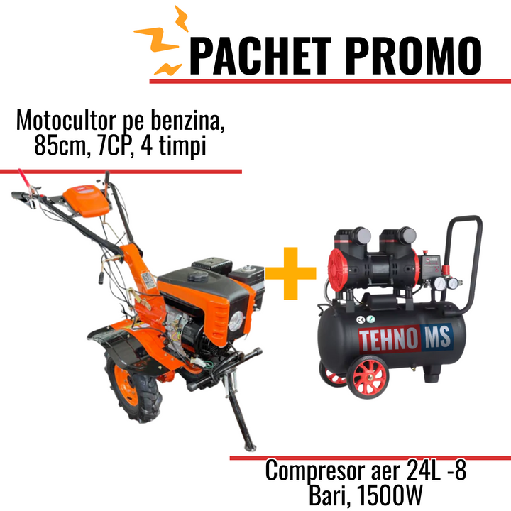 Pachet Promo: Motocultor pe benzina, 85cm, 7CP, 4 timpi + Compresor aer model JN1500A-24L -8 Bari, 1500W
