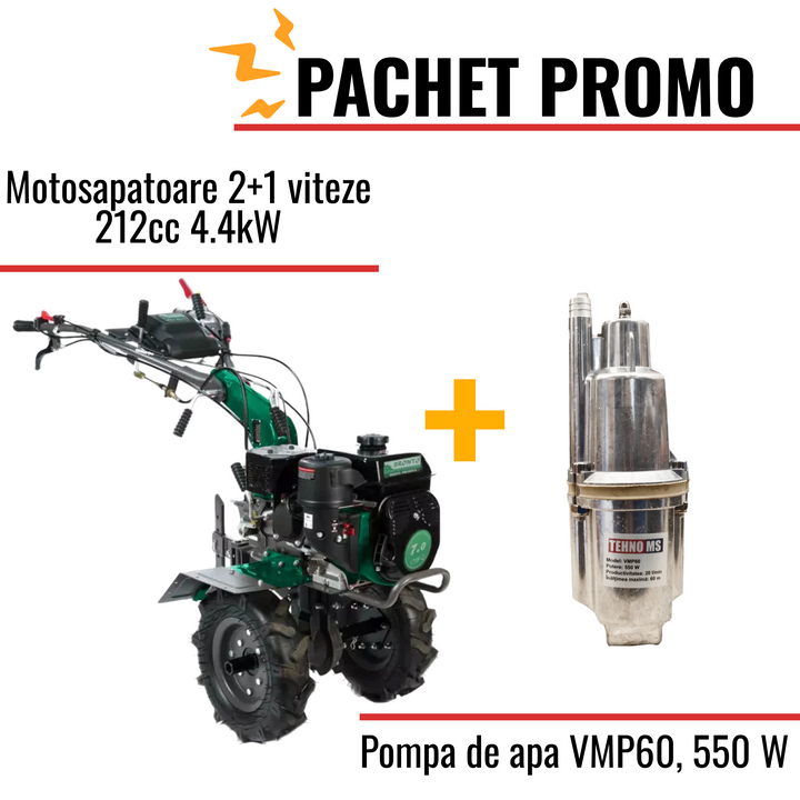 Pachet Promo: Motosapatoare 2+1 viteze 212cc 4.4kW + Pompa de apa pe vibratii pentru gradina VMP60, 550 W
